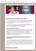 Great News!Louise returns to popular radio show!Turn on that AM radio! This will be Louise’s third guest-spot on nationally-syndicated Coast to Coast. Here are some fun testimonials from some previous interviews. Louise will be interviewed by George Noory on Friday, June 29th – from 10pm to midnight/Pacific (time zone calculator) Not sure where to listen? Things are speeding up! More great news ahead — stay tuned! It's all for you. Illuminations welcomes and embraces you on your spiritual journey. Louise is here to serve by helping to make your life brighter, to bring you closer to the Source, and to help make sense of this crazy world. It's always her intention to point you towards your greatest, most joyous future. Forward this to a friend |